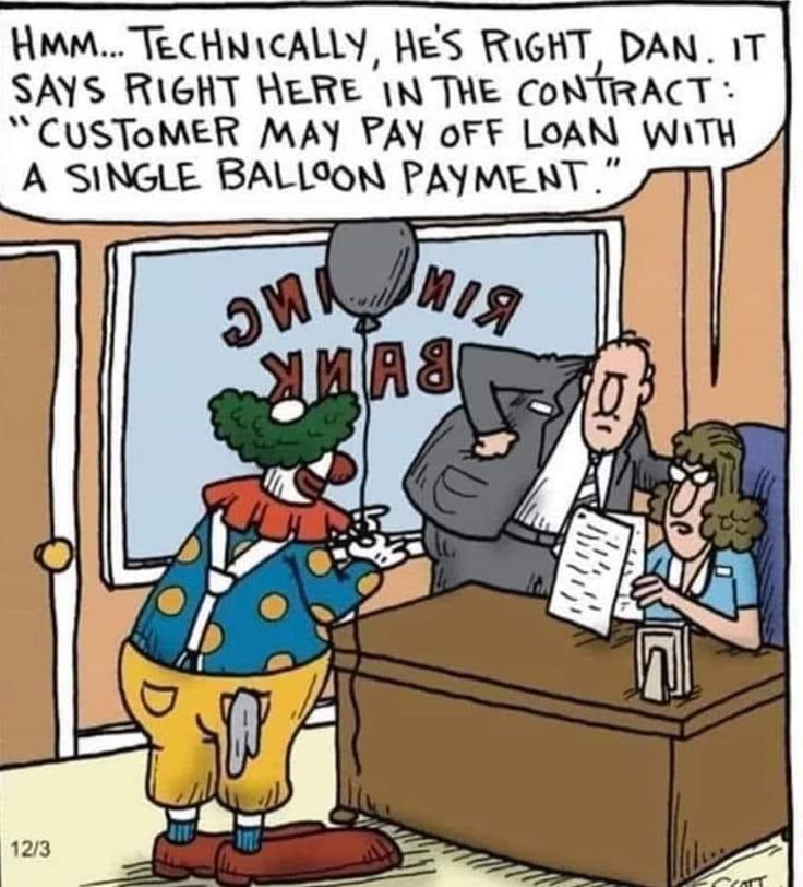 At a shady bank, a clown pays his loan with a balloon. The fine print wins. This absurd interpretation of “balloon payment” is the financial joke we all needed.
