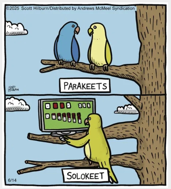 Two birds chatting on a branch, followed by one playing solitaire alone—it’s the introvert/extrovert gag we didn’t know we needed. The perfect pun-powered isolation comic.