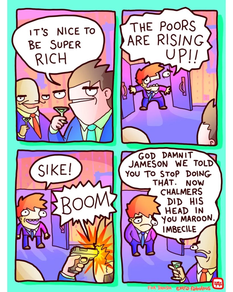 The “poors” rise up—only for the joke to be on the rich. A perfect blend of social commentary and slapstick chaos.