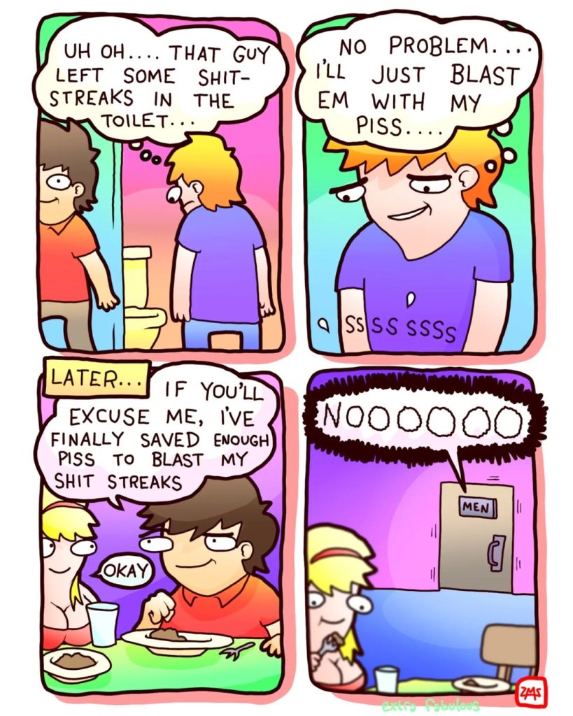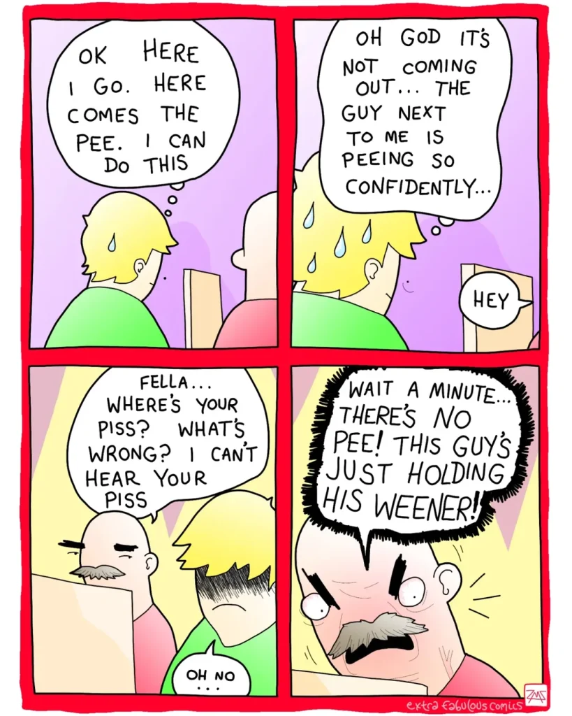Every guy knows the fear. This comic captures public restroom anxiety at its most hilarious and awkward.