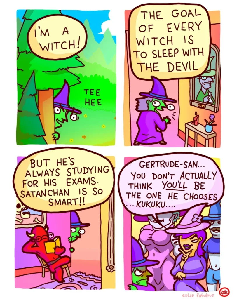 Witches fight for the devil’s attention—but he’s too busy studying. Black magic meets academic hustle in the funniest way.