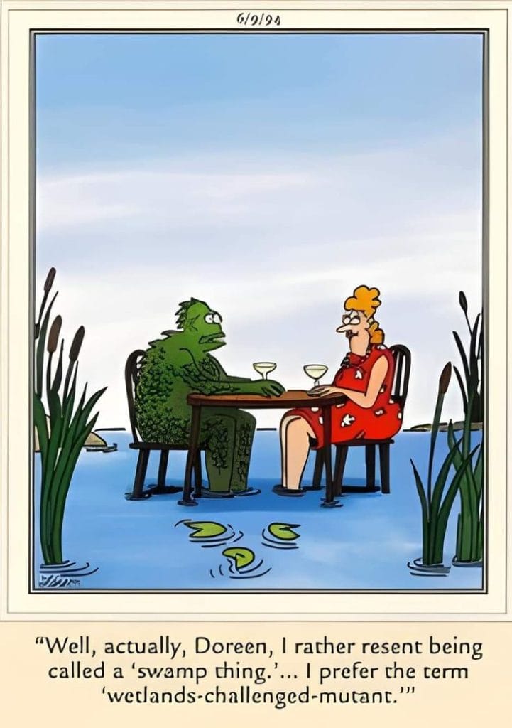 A swamp creature prefers the term “wetlands-challenged mutant.” It’s a dating strip that manages to mix political correctness with pond scum.
