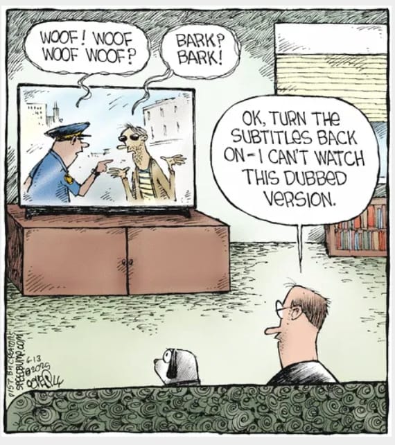 In a dubbed version of “woof woof” TV, a man can’t handle the dog-to-human voiceover. It’s an oddly specific joke… and that’s what makes it gold.
