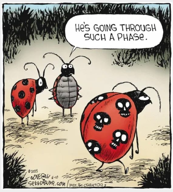 One beetle has traded spots for skulls. His family just sighs, “It’s a phase.” Ladybugs and teenage rebellion? This cartoon wins for sheer creative absurdity.