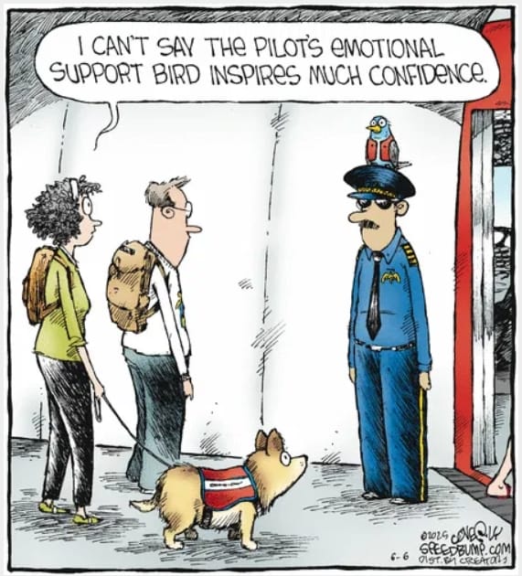 At airport check-in, the pilot’s “support bird” sits smugly on his hat. Confidence? Not quite. This cartoon nails travel anxiety with a feathered punchline.
