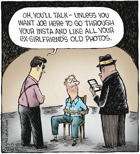Two interrogators threaten to like all your ex’s old Instagram pics. Honestly? More terrifying than waterboarding. It’s a modern joke with evil genius-level wit.