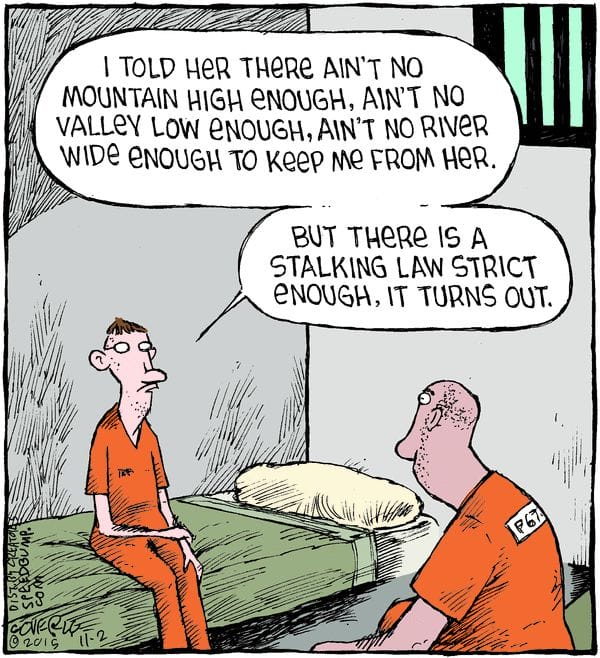 A prison inmate quotes the lyrics of “Ain’t No Mountain High Enough”… only to be interrupted with a punchline about stalking laws. It’s dark humor done hilariously right.