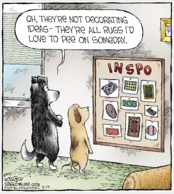 Two pups admire an “inspo” board of rugs—not to redecorate, but to pee on someday. It’s peak canine ambition with a side of design commentary.