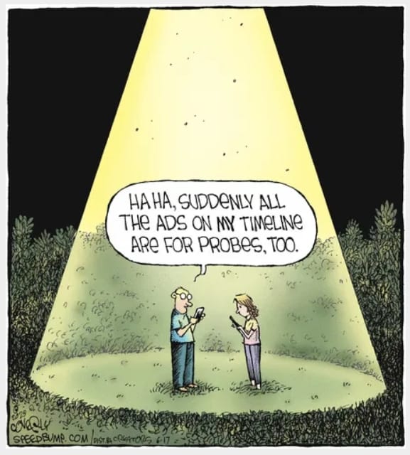 Caught in a tractor beam, one human comments, “Now my ads are all about probes.” Welcome to the terrifyingly hilarious era of hyper-targeted marketing.