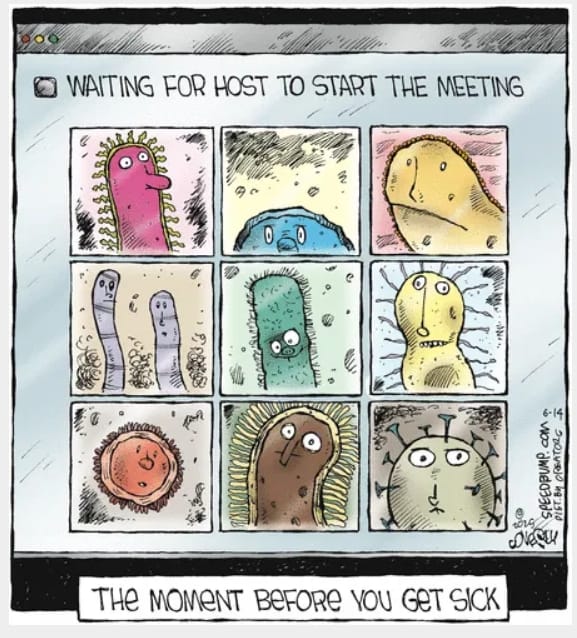 These microscopic organisms look suspiciously like your coworkers in a Zoom call. This clever crossover between sickness and workplace culture is grossly funny in all the right ways.
