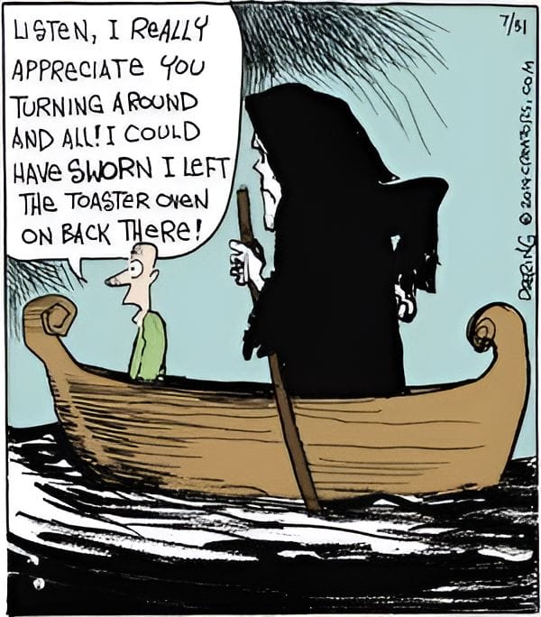 A man in a boat with the Grim Reaper sheepishly asks to turn back — he might’ve left the toaster oven on. Death seems oddly patient. It’s relatable humor wrapped in an existential dilemma. If you’ve ever had a panic moment mid-vacation or right after locking the door, you’ll chuckle at this dark yet domestic comedy