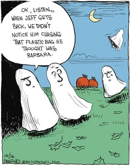Ghosts in a graveyard gossip about Jeff, who mistook a flying plastic bag for someone named Barbara. The visual of a ghost soaring after a rogue grocery bag while the others play it cool is hysterical. It’s simple yet effective — a blend of paranormal slapstick and social awkwardness from beyond the grave.