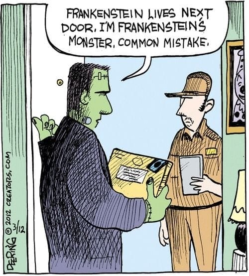 A delivery guy mixes up Frankenstein and his monster — and the monster corrects him. “Frankenstein lives next door. I’m Frankenstein’s monster. Common mistake.” It’s the Halloween correction we all needed. Deering turns a classic horror trope into a comically polite conversation, reminding us that even monsters hate being misidentified.