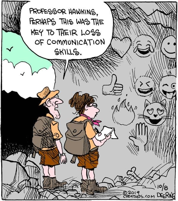Two explorers discover ancient cave drawings — not of animals or battles, but emojis. Thumbs up, fire symbols, cat faces, and LOLs. “Perhaps this was the key to their loss of communication skills,” one says. It’s a savage and brilliant jab at modern text culture. The idea that future archaeologists might think we worshipped smiley faces? Sadly…plausible.