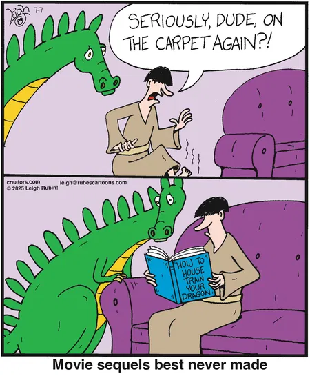 “On the carpet again?!” Only a new humor cartoon could turn “How to House Train Your Dragon” into an unexpected sequel. (Spoiler: The dragon’s still not trained.)