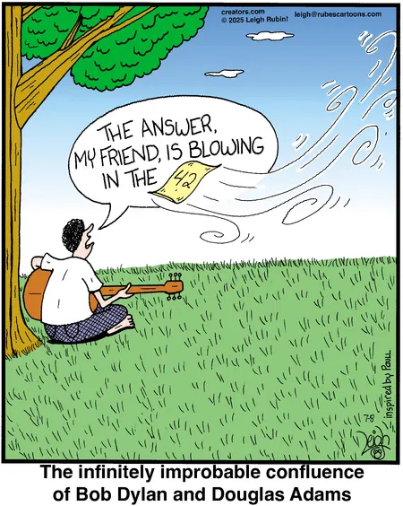 A Bob Dylan song lyric meets a Douglas Adams punchline. “The answer is blowing in the… 42.” If you know, you know. And if you don’t, just laugh anyway.