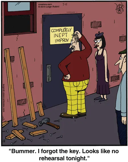 The “Completely Inept Improv” troupe forgets the key—and clearly tried to build their own door. When it comes to new humor cartoons, even the background jokes are worth a double-take.