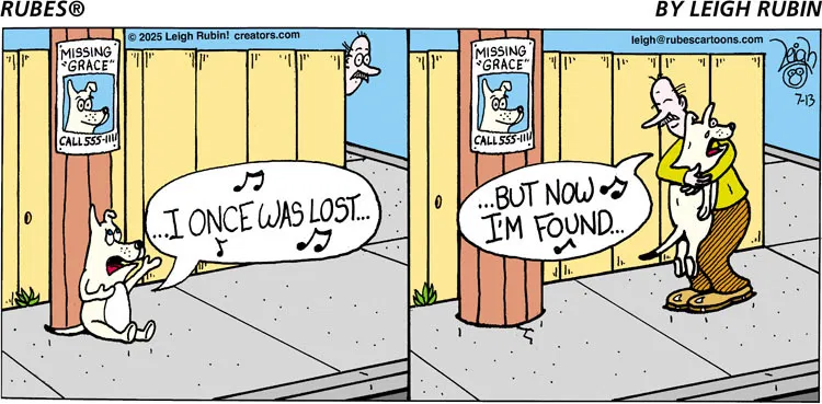 A missing dog belts out “I once was lost… but now I’m found!” in a two-panel musical miracle. The sweetest new humor cartoon of the bunch.