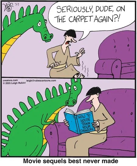 “On the carpet again?!” Only a new humor cartoon could turn “How to House Train Your Dragon” into an unexpected sequel. (Spoiler: The dragon’s still not trained.)