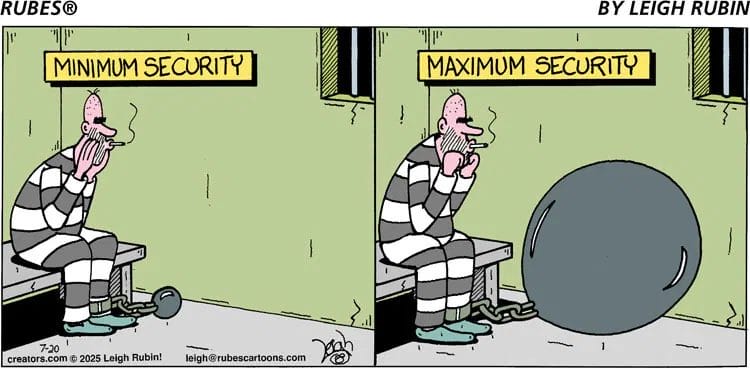 Minimum security? Small ball and chain. Maximum security? Giant ball and chain. It’s the kind of literal humor you wish you’d thought of first.