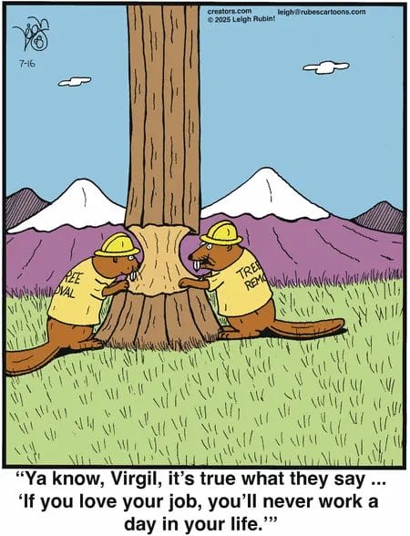 Beavers “working” as tree removal experts because they love their job. New humor cartoons prove: If you love what you do, you’ll never work a day in your life (unless you’re a tree).