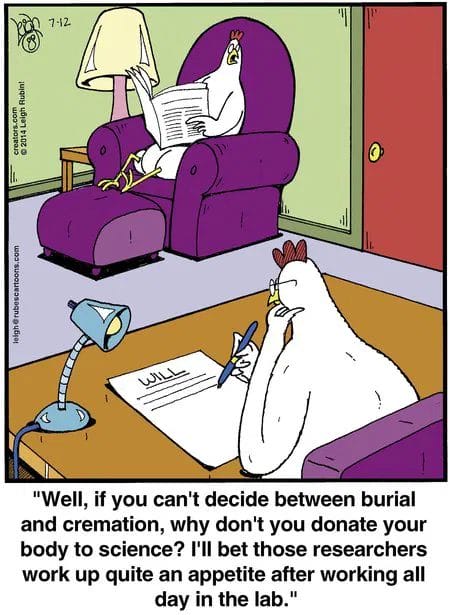 Should a chicken donate its body to science—or just feed the researchers? Cartoon existentialism at its finest.