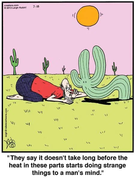 A man in the desert starts seeing things—and making friends with a cactus. Proof that even new humor cartoons can deliver a visual punchline hotter than the sun.