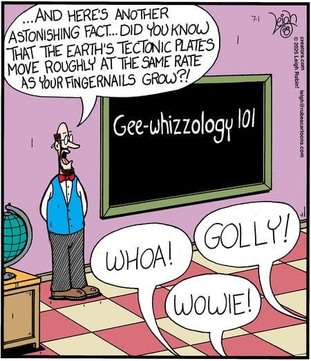 Did you know tectonic plates move as fast as fingernails grow? Neither did anyone in this cartoon, and the responses are pure gold: “Whoa! Golly! Wowie!” Who needs a science degree when you’ve got cartoons?