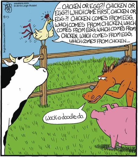 A frantic chicken spirals into an infinite loop of logic while the farm animals roll their eyes. Existential comedy, barnyard style.