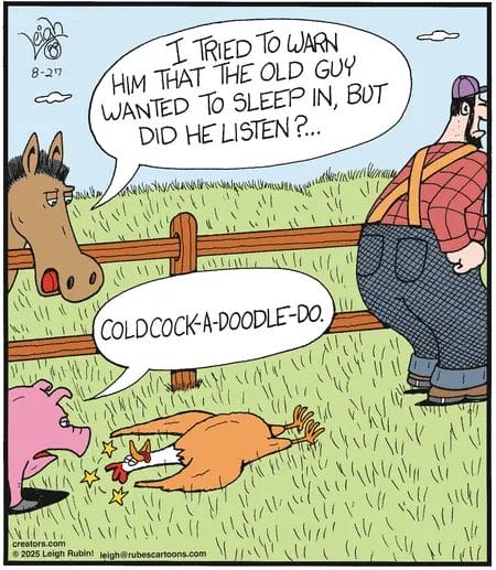 A rooster tries to crow too early and gets knocked out. The barnyard delivers a knockout punchline.
