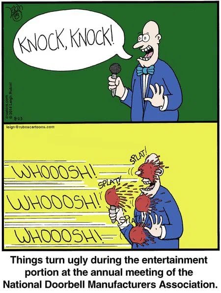 At a doorbell convention, a knock-knock joke ends in disaster. Proof that even puns can get dangerous.