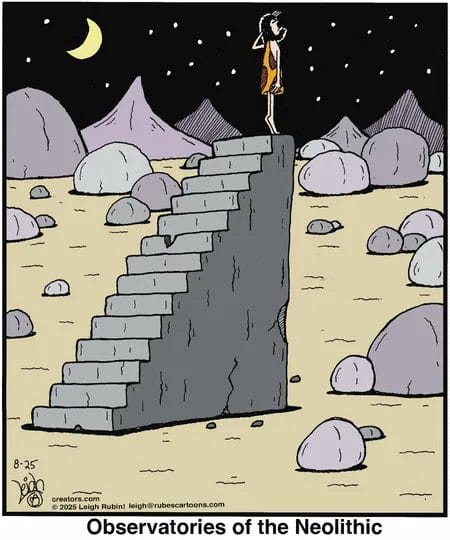 A caveman climbs a giant staircase to “observe the stars.” Minimalist humor with a prehistoric twist.