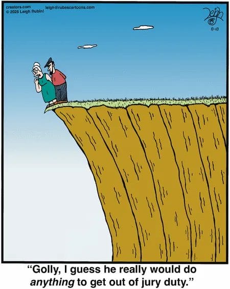 A man takes “anything to get out of jury duty” a little too far—by diving off a cliff. Overly dramatic and hilarious.
