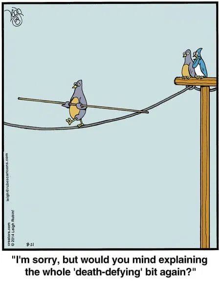 Pigeons on a wire, one attempting a death-defying stunt, hilariously second-guessing their plan. Bird brains at their best.