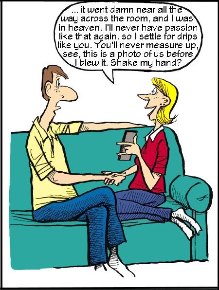 Romance reduced to a memory on a phone. Sharp, biting humor that stings as much as it amuses.