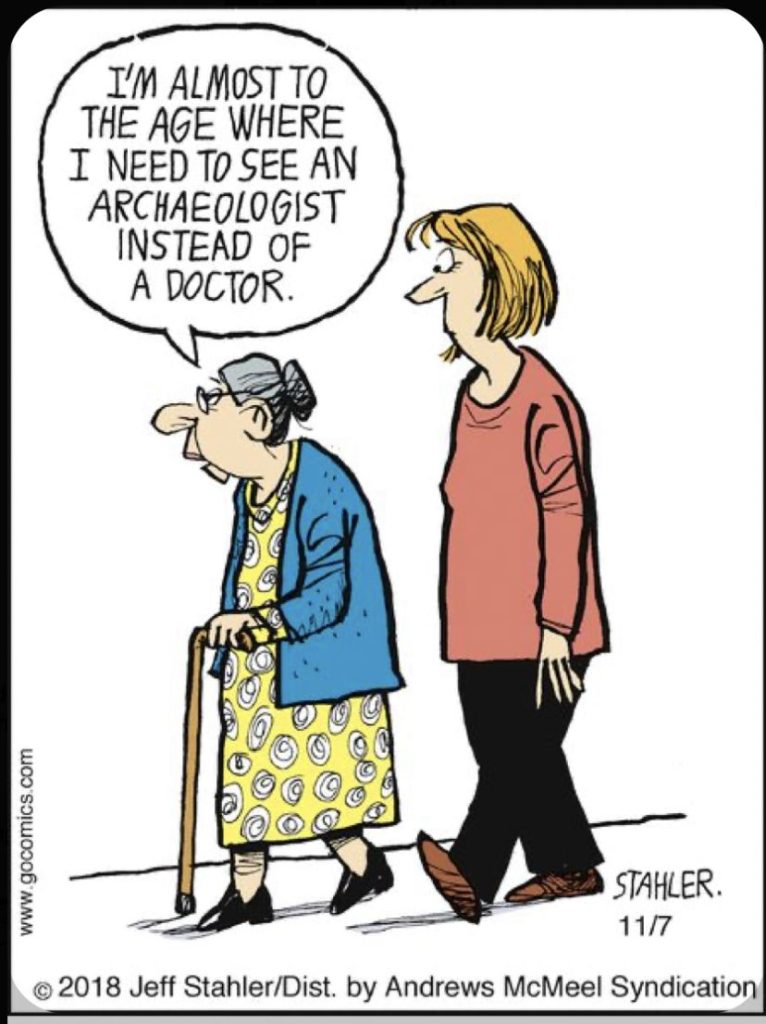 An elderly woman jokes she’s old enough for an archaeologist instead of a doctor. Dark humor wrapped in self-awareness.