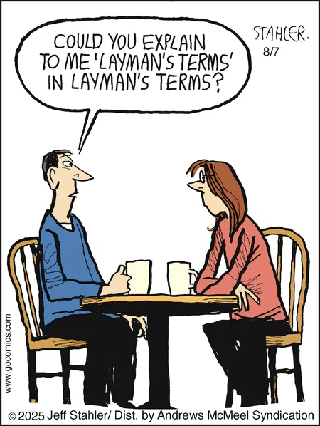 When someone asks for “layman’s terms” in layman’s terms, you know comedy’s about to happen. A smart twist on wordplay.