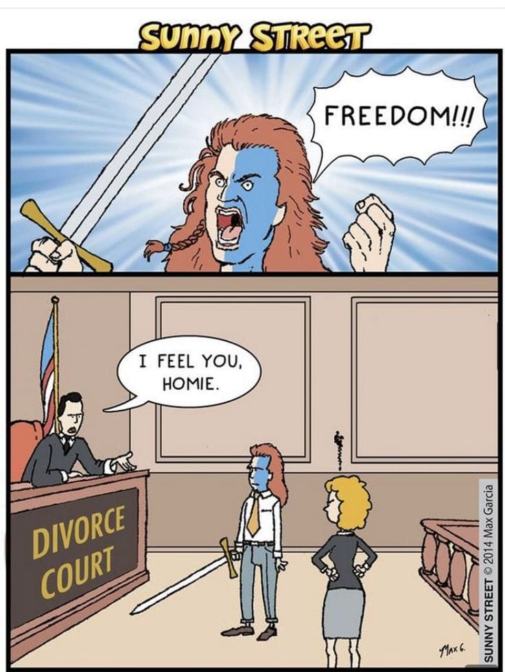 A blue-faced warrior yells “FREEDOM!” in court. It’s an absurd yet completely relatable take on modern breakups. The judge casually saying, “I feel you, homie,” makes this one of Max’s best subversive punchlines.