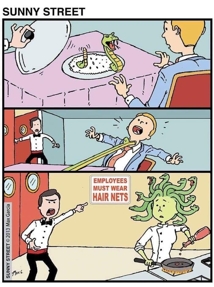 A customer screams after being served a snake. But the real problem? Medusa’s hair violates the dress code. This wild workplace joke is so absurd it circles back to brilliant. Also: excellent use of myth and HR policy.