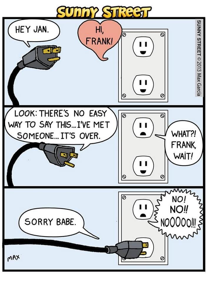 Jan and Frank, two electrical plugs, have a dramatic breakup as one leaves for a new outlet. It’s soap opera energy mixed with hardware absurdity. The final panel scream is surprisingly touching—and totally ridiculous.