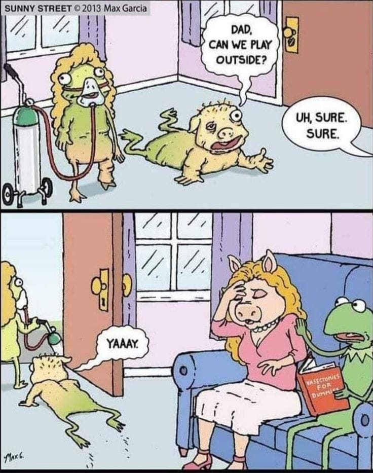 In this wild take on genetics and Muppets, Miss Piggy and Kermit’s offspring resemble radioactive swamp creatures. A satirical jab at cartoon pairings gone wrong, it’s equal parts horrifying and hilarious. Bonus laugh for the “Vasectomies for Dummies” book.