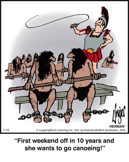 Nothing says “time off” like being chained to a galley and forced to go canoeing. The ultimate “careful what you wish for” moment, delivered with Herman’s trademark grin.