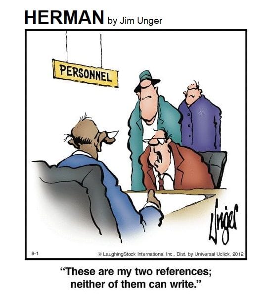 References are tough. Especially when neither can write. Herman’s humor about job interviews is timeless and, let’s be honest, painfully relatable.
