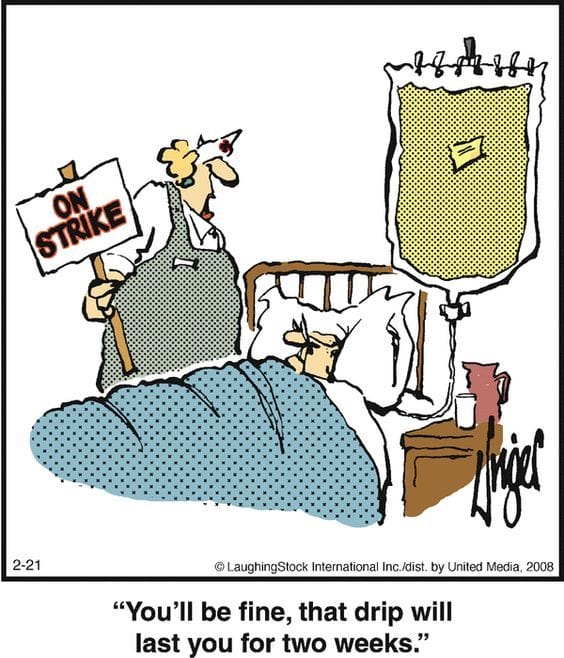 Nurse strikes don’t stop the punchlines. “You’ll be fine, that drip will last you two weeks.” Brutal, hilarious, and right on trend.