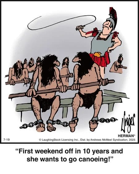 Nothing says “time off” like being chained to a galley and forced to go canoeing. The ultimate “careful what you wish for” moment, delivered with Herman’s trademark grin.