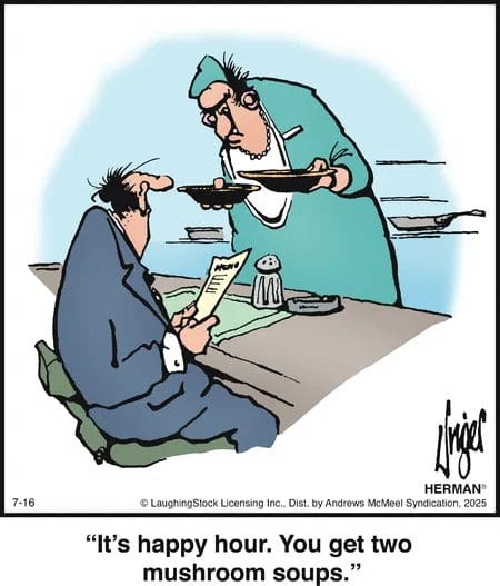 Happy hour just means more of the same…even if it’s two mushroom soups. The resigned look says it all.