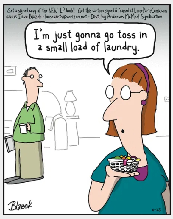 She’s off to toss in a “small load” of laundry—except it’s a hilariously tiny basket. Literal humor hits hard here, and so does that tiny scoop of detergent.