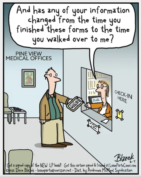 A medical receptionist asks if any info has changed—between filling out the form and handing it in. The answer is obviously no… unless we live in a cartoon.