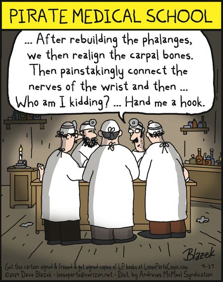 A pirate surgeon gives up on reconstructive surgery and reaches for a hook. Honestly? At least he’s self-aware. Plus, hooks are classic.