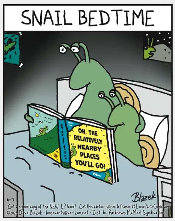 Snail parents read “Oh, The Relatively Nearby Places You’ll Go!” to their kid. It’s like Dr. Seuss, but for slugs. Slow and steady wins bedtime.